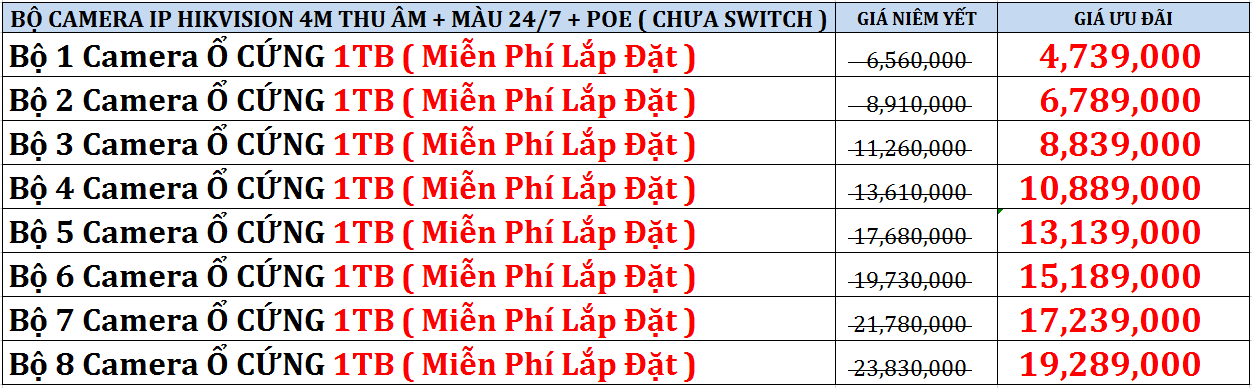 Trọn gói lắp đặt camera an ninh chống trộm tích hợp thu âm có màu ngày đêm chuẩn IP chính hãng Hikvision 4M đã bao gồm: